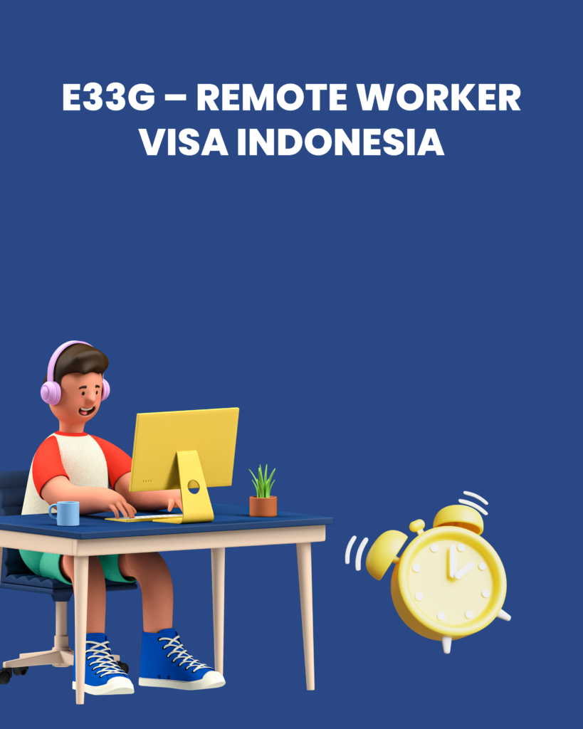 The E33G Remote Worker Visa grants legal residence for foreign professionals working remotely. It is ideal for digital nomads, freelancers, and remote employees who wish to reside in Indonesia while working for clients or employers based outside the country.
